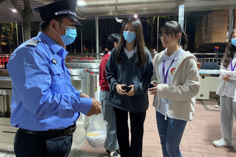 实践部小伙伴们手提爱心糖水,探访了C3、C5、C7、C9、C10、C13、C14这7栋宿舍的守夜人。送糖水最后一站,来到了校门口的保安处!夜色已晚,校门口的保安依然在校门口处笔直地站立着,给出入校园的车辆依次进行登记。