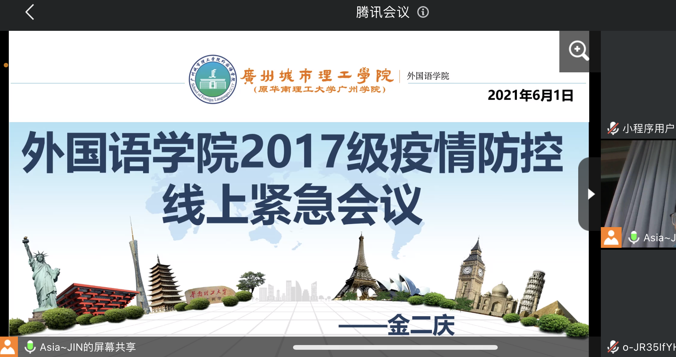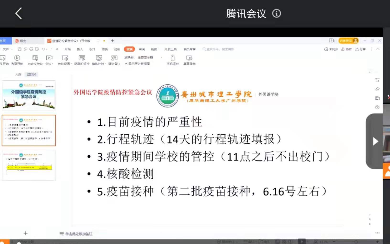本网讯(记者:吴琛茜)2021年6月1日下午4点,Bevictor伟德学工办在A6-110召开了学院疫情防控紧急工作会议,学工办全体老师参加了此次会议。根据当前疫情防控工作形势的要求以及学校的指示下,Bevictor伟德各年级辅导员一致决定第一时间对全年级学生传达疫情防控工作要求,并于当日晚上6点至9点在腾讯会议对学院全年级学生召开了线上疫情防控工作会议。