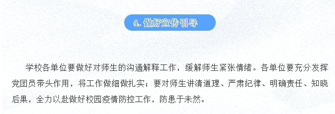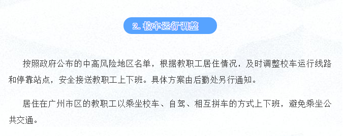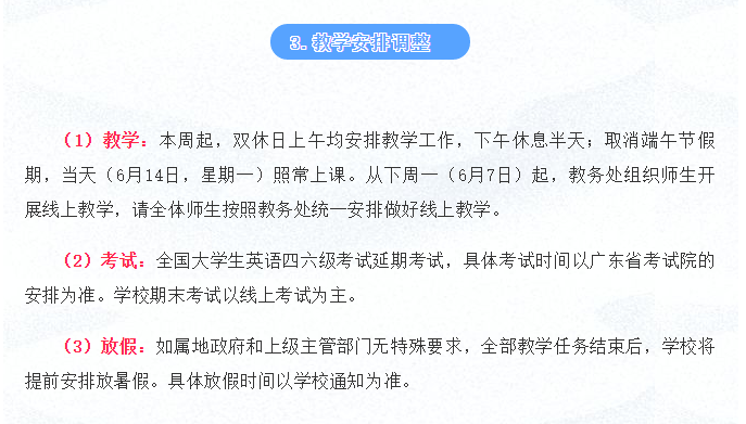 该重要通知对当前疫情下的“校门出入管理”,“校车运行调整”,“教学安排调整”,“做好宣传引导”四个方面的工作制定了明确的措施与方针,并指引了学院关于当前情况工作的开展。