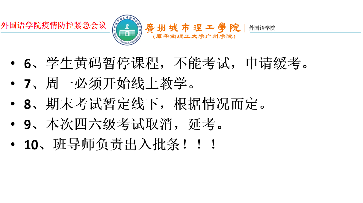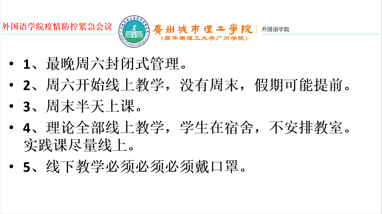 根据学校最新疫情防控要求,全体学生在如实做好14天行程轨迹记录的基础之上,积极配合学校及学院最新的管理要求,如封闭式管理;在宿舍内进行线上学习,线下教学必须戴口罩;尽量不出校,要出校,需严格填写正确请假条并经过班导师、辅导员、学院三方的签名及允许等。