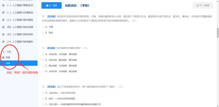 1、完成所有课程活动后,点击【考核】完成试卷考核