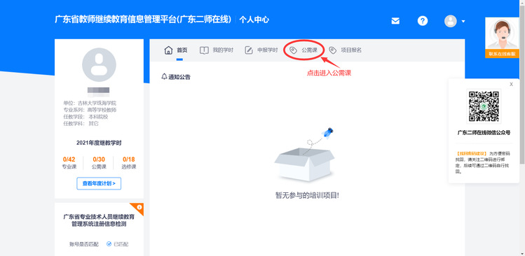 ·公需课学习请点击此网站左下角跳转至广东省教师继续教育信息管理平台(广东二师在线)个人中心进行学习。