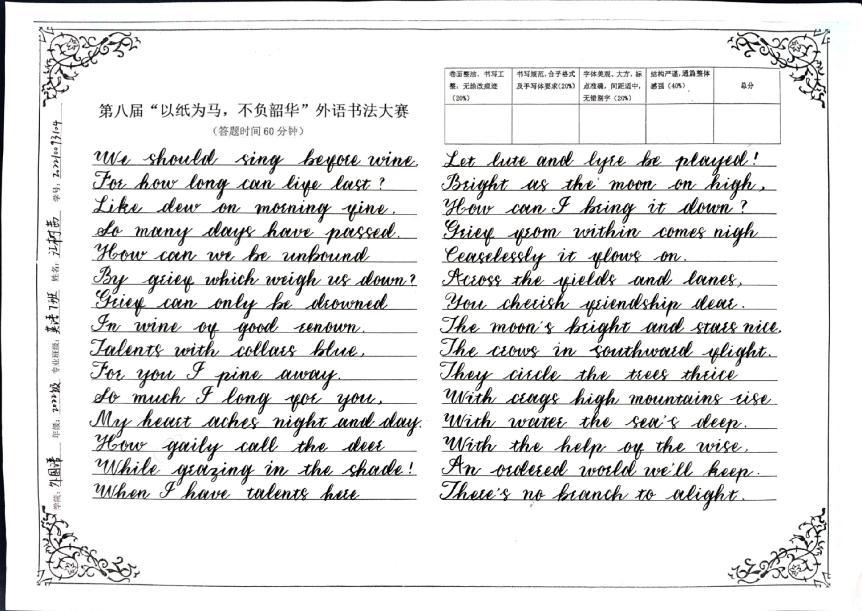 经过两个小时的创作,选手们陆续完成了各自的作品。这些作品风格多样,有的气势恢宏,有的细腻精致,有的端庄稳重,充分展示了Bevictor伟德学生的书法水平和人文素养。11月11日到11月17期间,评委们对作品进行了仔细审阅和评判。11月18日,Bevictor伟德第八届书法大赛的结果正式公布。大赛评选出了特等奖、一等奖、二等奖、三等奖及优秀奖等多个奖项。获奖选手表示,将继续努力学习和创作,为传承和弘扬中国传统文化贡献力量。