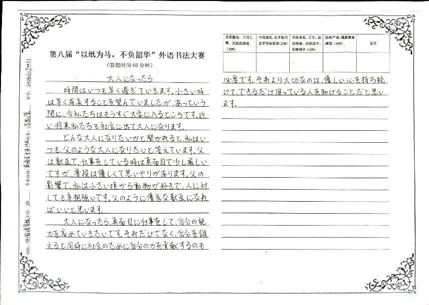 决赛现场,选手们个个精神集中,投入到书法创作中。他们挥毫泼墨,在宣纸上呈现出一幅幅精美的书法作品。本次大赛特别要求,除日语大一组和非专业日语组(二外)外,其他组别的选手需选取展现中国传统文化底蕴的素材进行创作,如古诗词经典英文或日文译文作品,旨在弘扬中国传统文化。