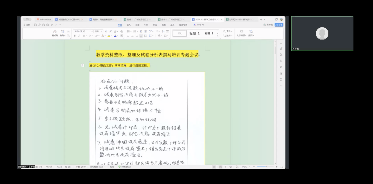 针对2024-2025学年第一学期的资料,会议明确了教学资料整理的变化与资料提交的规范性。乔世燕副院长就资料整理与检查工作提出了四项具体要求:首先,试卷分析工作必须具有针对性;其次,专项检查的责任需明确分配至每位审核与检查人员;第三,试卷评阅及成绩复核应严格遵循既定格式和要求;最后,正考和重修考试资料需分别归档并妥善保存。