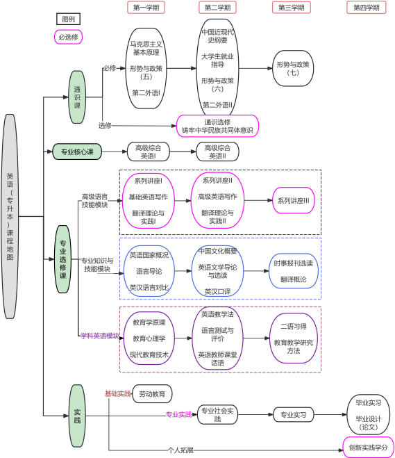 1.创新创业课: 创新创业基础、创业选修课 、学科英语模块课程 2.跨学科交叉课: 教育学原理 、英语教学法 、教育心理学
