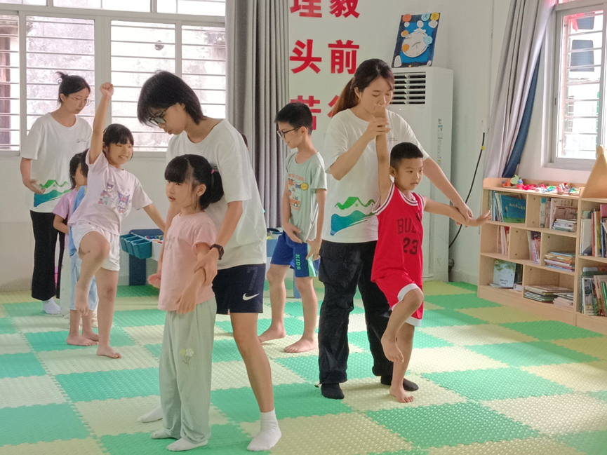 舞蹈是无声的语言,孩子们在模仿中加深对外界事物的认识和理解。实践团成员李嘉盈和苏靖炫结合小朋友们的实际情况,选取节奏感和律动性较强的舞蹈片段进行教学,旨在培养孩子们活泼个性和身体协调性。