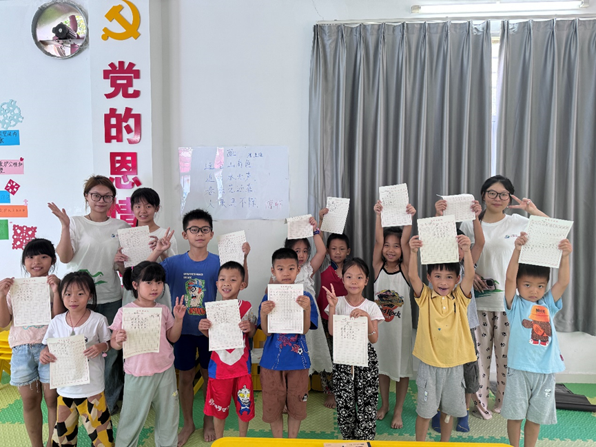 书法作为中国传统文化的瑰宝,是一种艺术形式,更是一种精神修养和个性表达的方式。为了让孩子们在一笔一划中感受汉字之美,实践团成员郑美婷和陈嘉芳通过分析诗歌中汉字的结构、强调笔划力度控制以及趣味汉字小游戏等方法,逐步培养孩子们的耐心与专注力以及良好的审美情趣。