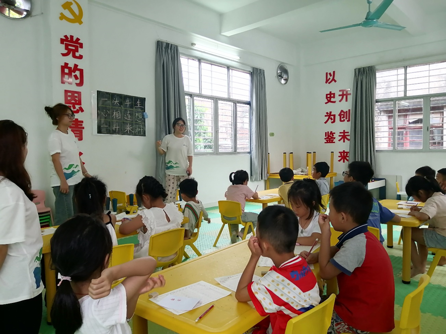 7月18日上午,团队成员郑美婷和陈嘉芳为小朋友们带来基础硬笔书法教学——脍炙人口的古诗《画》。孩子们在书写语言优美且意境深远的诗词中,逐渐培养起文学素养和审美情趣。授课老师首先讲解了硬笔书法的基本知识和技巧,包括握笔姿势、运笔方法、字体结构等。然后,她们向小朋友们作示范教学,一笔一划地教孩子们书写每一个字。在课堂中,小朋友们都非常认真地听讲和模仿,营造出融洽和谐的氛围。