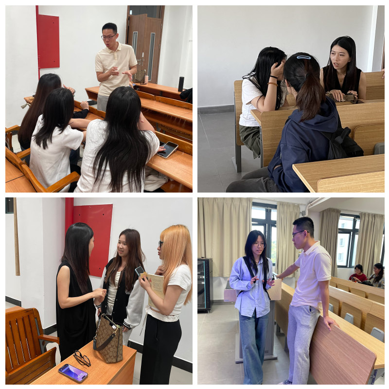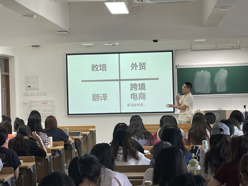 随后,梁智钧师兄先介绍了自己的大学生活以及工作历程。他在大一加入了辩论队,培养了自己的逻辑思维能力,提高了语言表达能力和胆量;2017-2020年接触了外贸行业;2020-2025年自己创业,从事箱包制造。梁师兄就外贸的行业前景向同学们分享了四种就业渠道及其推广途径和特点。他认为第一份工作是很重要的,无论去大企业还是小企业,主动积极地参加工作的探索,是将来面临机会时的底气,有了底气才会有信心去做。并与大家一起探讨了美国关税战背景下外贸行业的前景预想。