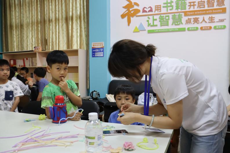 在志愿者的引导下,小朋友们迫不及待地开始了自己的创作之旅。他们拿起扭扭棒,小心翼翼地尝试着弯曲和缠绕。志愿者们始终陪伴在他们身边,手把手地指导,一个个充满创意的作品开始在他们手中诞生。